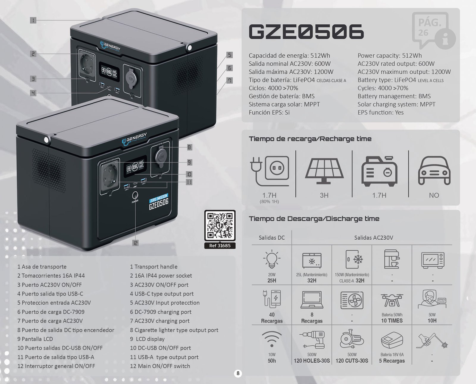 | GZE0506 | 512 Wh | 600 W | 1.200 W | 1,7 h | ~240 W | 4.000 | Ocio / camper |