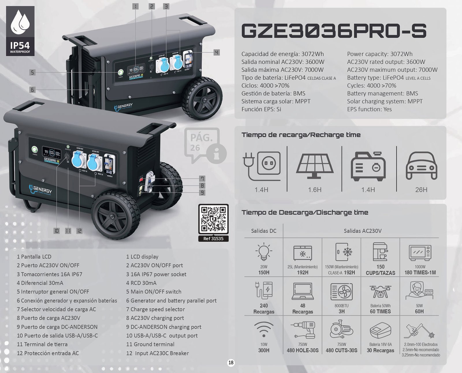 GZE3036 PRO-S 3.072 Wh 3.600 W 7.000 W 1,4 h 2.100 W 4.000 Profesional obra